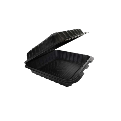 RECYCLABLE, MICROWAVABLE 8"?8" ONE COMPARTMENT HINGED CONTAINER BLACK