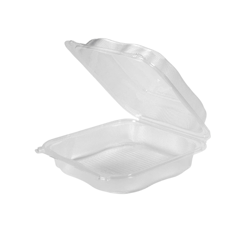 RECYCLABLE, MICROWAVABLE 8"X8" ONE COMPARTMENT CLEAR HINGED CONTAINER